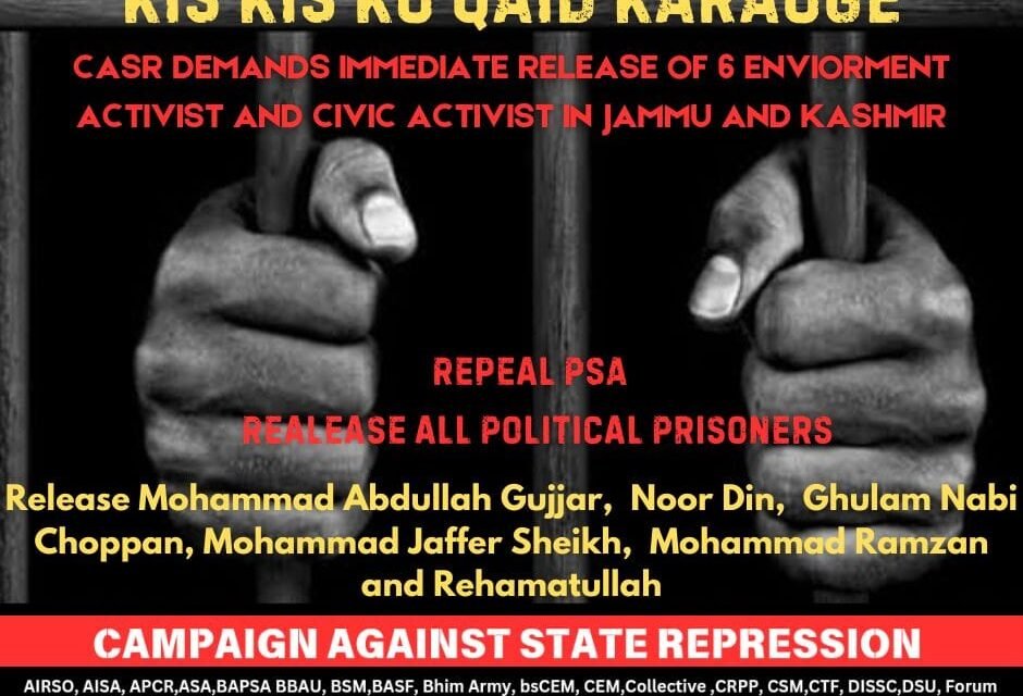 గత వారంలో జమ్ము కశ్మీర్లోని కిష్త్వర్ జిల్లాలో పబ్లిక్ సేఫ్టీ యాక్ట్ (PSA) కింద ఐదుగురు యూనియన్ నాయకులను అరెస్టు చేశారు. ఈ దారుణ చర్య జరిపిన వెంటనే నవంబర్ 9న దోడాకు చెందిన మరో కార్యకర్తను కూడా అదే చట్టం కింద అరెస్టు చేశారు. వారిని దేశ వ్యతిరేకులుగా ముద్ర వేయడానికి తమ జిల్లాల్లో పర్యావరణ, ఆరోగ్య న్యాయానికి సంబంధించిన సమస్యలను లేవనెత్తడం సరిపోతుంది. అదే నమూనాలో అస్సాం, గౌహతిలోని భరలుముఖ్లో భారీగా చెట్లు నరకడాన్ని వ్యతిరేకిస్తూ నిరసన వ్యక్తం చేస్తున్న విద్యార్థులు, యువ కార్యకర్తలను అరెస్టు చేసి జైలుకు పంపారు.