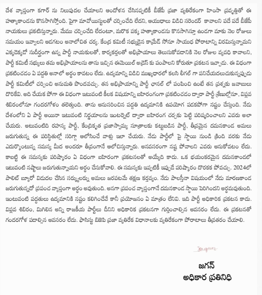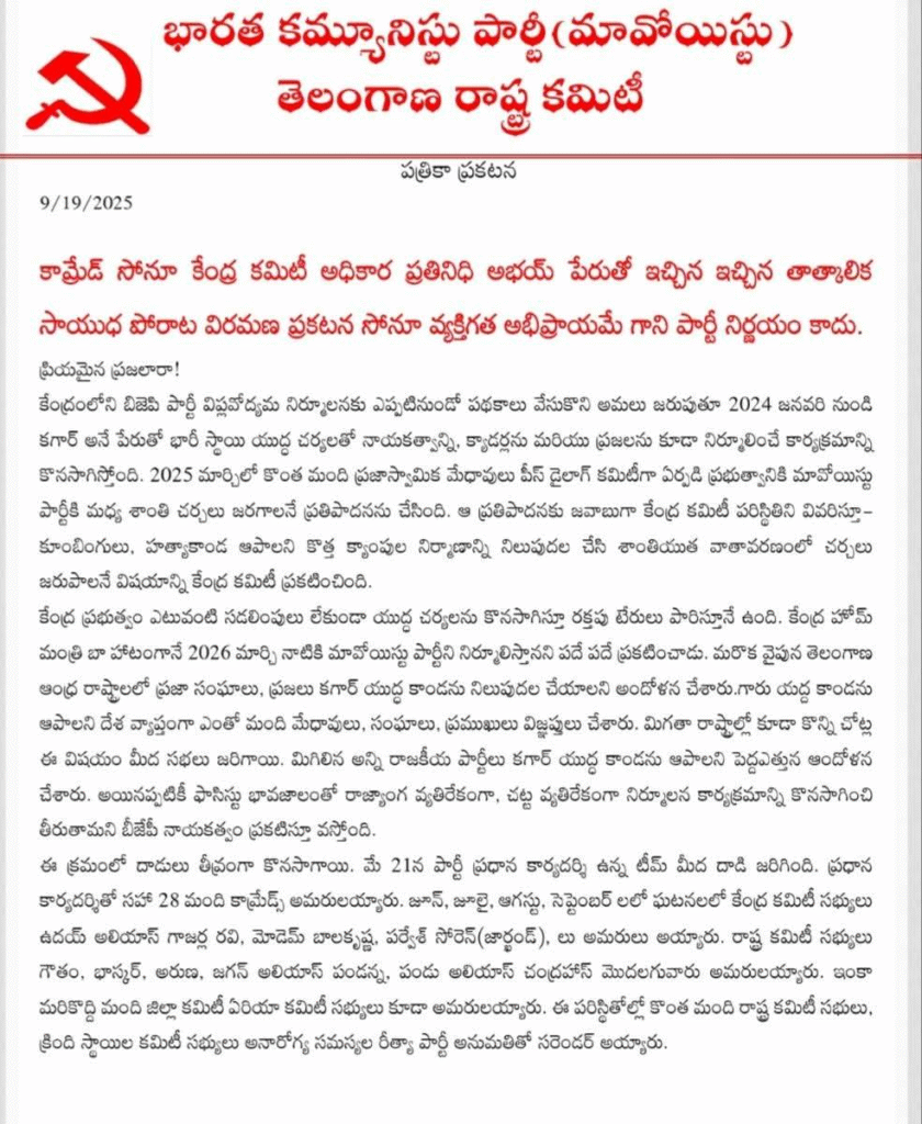 కామ్రేడ్ సోనూ కేంద్ర కమిటీ అధికార ప్రతినిధి అభయ్ పేరుతో ఇచ్చిన ఇచ్చిన తాత్కాలిక
