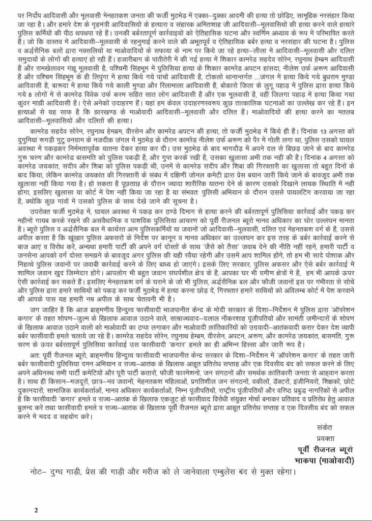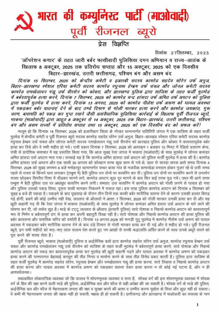 కోబ్రా, జార్ఖండ్ పోలీసులు కుట్రపూరితంగా బూటకపు ఎన్కౌంటర్లో మావోయిస్టు పార్టీ కేంద్ర కమిటీ, ERB సభ్యుడు కామ్రేడ్ సహదేవ్ సోరెన్ అలియాస్ అనుజ్, బీహార్-జార్ఖండ్ స్పెషల్ ఏరియా కమిటీ సభ్యుడు కామ్రేడ్ కామ్రేడ్ రఘునాథ్ హెంబ్రామ్ అలియాస్ చంచల్, జోనల్ కమిటీ సభ్యుడు కామ్రేడ్ రామ్ఖేలవన్ గంజు అలియాస్ వీర్సేన్లను దారుణంగా హత్య చేయడం, సెప్టెంబర్ 7, 2025న పోలీసులు బూటకపు ఎన్కౌంటర్లో కామ్రేడ్ చంద్రహంస్ దా అలియాస్ అమిత్ అలియాస్ అప్టన్ హత్య సెప్టెంబర్ 13, 2025న కామ్రేడ్ నీలేష్ అలియాస్ అరుణ్ను గాయపడిన స్థితిలో పట్టుకుని, క్రూరంగా చంపడం; కామ్రేడ్ జైకాంత్, గురు చరణ్, బాస్మతిని పట్టుకుని నిర్బంధించడం వంటి రాజ్యాంగ విరుద్ధమైన పోలీసు చర్యలకు నిరసనగా తూర్పు ప్రాంతీయ బ్యూరో, అక్టోబర్ 8 నుండి అక్టోబర్ 14 వరకు ప్రతిఘటన వారోత్సవం, అక్టోబర్ 15న ఒక రోజు బంద్ పాటించాలిని పిలుపునిస్తోంది.
