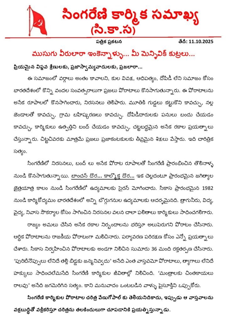 శ్రమదోపిడీ లేని సమాజ లక్ష్యంగా చట్టబద్ధ, ప్రజాస్వామ్యయుత పోరాటాలను సికాస కొనసాగిస్తుంది. కార్మికుల సమస్యల పరిష్కారం కోసం మెజారిటీ కార్మికుల అభిప్రాయాలతో అన్ని పోరాట రూపాల్లో ముందుకు సాగుతుంది. “ఓటమి విజయానికి తల్లిలాంటిది”. ఉద్యమాల్లో, పోరాటాల్లో స్థల మార్పిడి ఉంటుంది కాని “అస్త్ర సన్యాసం” ఉండదు. ఇవన్ని వేణుగోపాల్ కు తెలియనివి కావు, భోదించనివి కావు, పేజీల కొద్ది రాయనివి కావు. పచ్చకామర్ల రోగిలాగా ఇప్పుడు పూర్తి విరుద్ధంగా మాట్లాడుతున్నాడు… గుంపుకడుతున్నాడు… ఆయన చెప్తున్న ఈ సిద్ధాంతం చెల్లుబాటు కాదనేది తెలిసి కూడా గందరగోళం సృష్టిస్తున్నాడు.