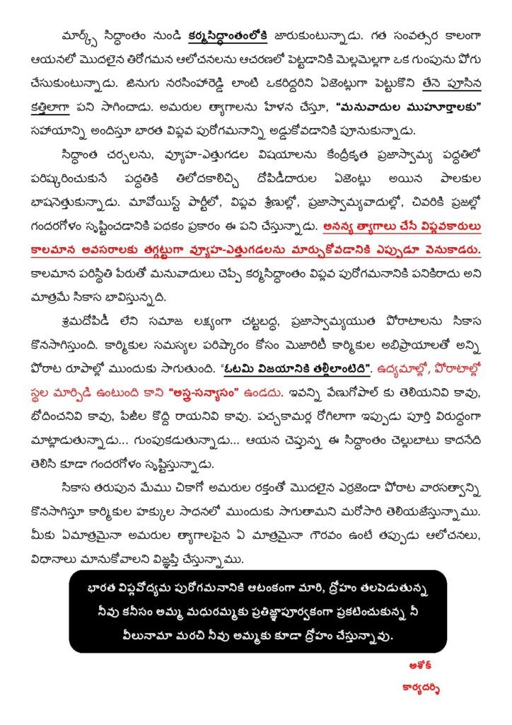 మార్క్స్ సిద్ధాంతం నుండి కర్మసిద్ధాంతంలోకి జారుకుంటున్నాడు. గత సంవత్సర కాలంగా ఆయనలో మొదలైన తిరోగమన ఆలోచనలను ఆచరణలో పెట్టడానికి మెల్లమెల్లగా ఒక గుంపును పోగు చేసుకుంటున్నాడు. జినుగు నరసింహారెడ్డి లాంటి ఒకరిద్దరిని ఏజెంట్లుగా పెట్టుకొని తేనె పూసిన కత్తిలాగా పని సాగించాడు. అమరుల త్యాగాలను హేళన చేస్తూ, “మనువాదుల ముహూర్తాలకు” సహాయాన్ని అందిస్తూ భారత విప్లవ పురోగమనాన్ని అడ్డుకోవడానికి పూనుకున్నాడు.