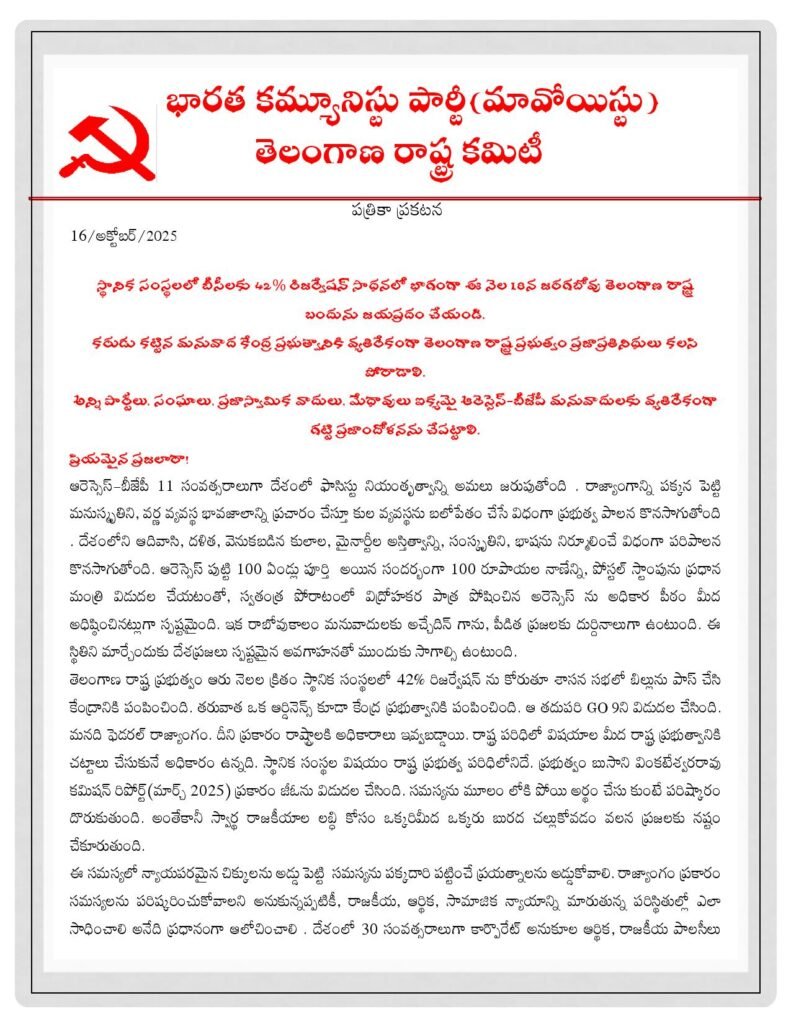 అక్టోబర్ 24న దేశవ్యాప్త బంద్ కు పిలుపునిచ్చిన మావోయిస్టు పార్టీ