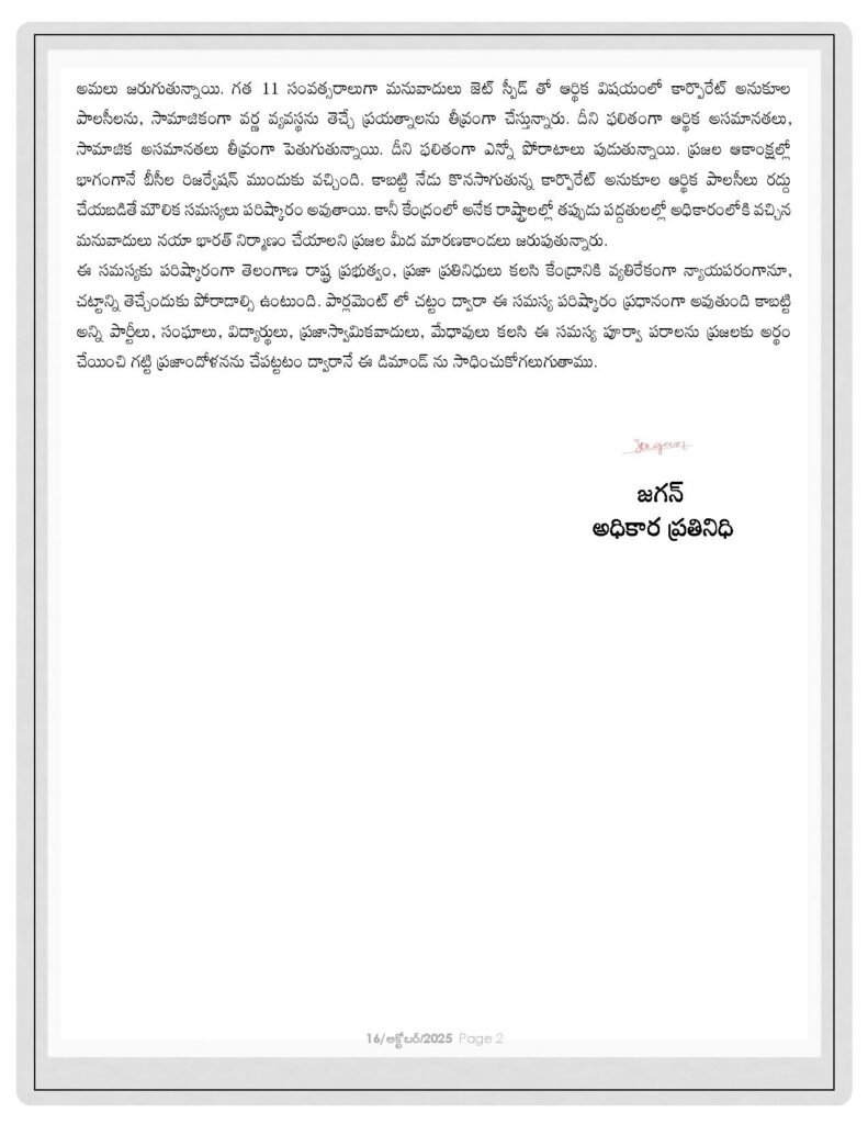 ఈ సమస్యలో న్యాయపరమైన చిక్కులను అడ్డు పెట్టి సమస్యను పక్కదారి పట్టించే ప్రయత్నాలను అడ్డుకోవాలి. రాజ్యాంగం ప్రకారం సమస్యలను పరిష్కరించుకోవాలని అనుకున్నప్పటికీ, రాజకీయ, ఆర్థిక, సామాజిక న్యాయాన్ని మారుతున్న పరిస్థితుల్లో ఎలా సాధించాలి అనేది ప్రధానంగా ఆలోచించాలి . దేశంలో 30 సంవత్సరాలుగా కార్పొరేట్ అనుకూల ఆర్థిక, రాజకీయ పాలసీలు అమలు జరుగుతున్నాయి. గత 11 సంవత్సరాలుగా మనువాదులు జెట్ స్పీడ్ తో ఆర్థిక విషయంలో కార్పొరేట్ అనుకూల పాలసీలను, సామాజికంగా వర్ణ వ్యవస్థను తెచ్చే ప్రయత్నాలను తీవ్రంగా చేస్తున్నారు. దీని ఫలితంగా ఆర్థిక అసమానతలు, సామాజిక అసమానతలు తీవ్రంగా పెరుగుతున్నాయి. దీని ఫలితంగా ఎన్నో పోరాటాలు పుడుతున్నాయి. ప్రజల ఆకాంక్షల్లో భాగంగానే బీసీల రిజర్వేషన్ ముందుకు వచ్చింది. కాబట్టి నేడు కొనసాగుతున్న కార్పొరేట్ అనుకూల ఆర్థిక పాలసీలు రద్దు చేయబడితే మౌలిక సమస్యలు పరిష్కారం అవుతాయి. కానీ కేంద్రంలో అనేక రాష్ట్రాలల్లో తప్పుడు పద్దతులల్లో అధికారంలోకి వచ్చిన మనువాదులు నయా భారత్ నిర్మాణం చేయాలని ప్రజల మీద మారణకాండలు జరుపుతున్నారు.