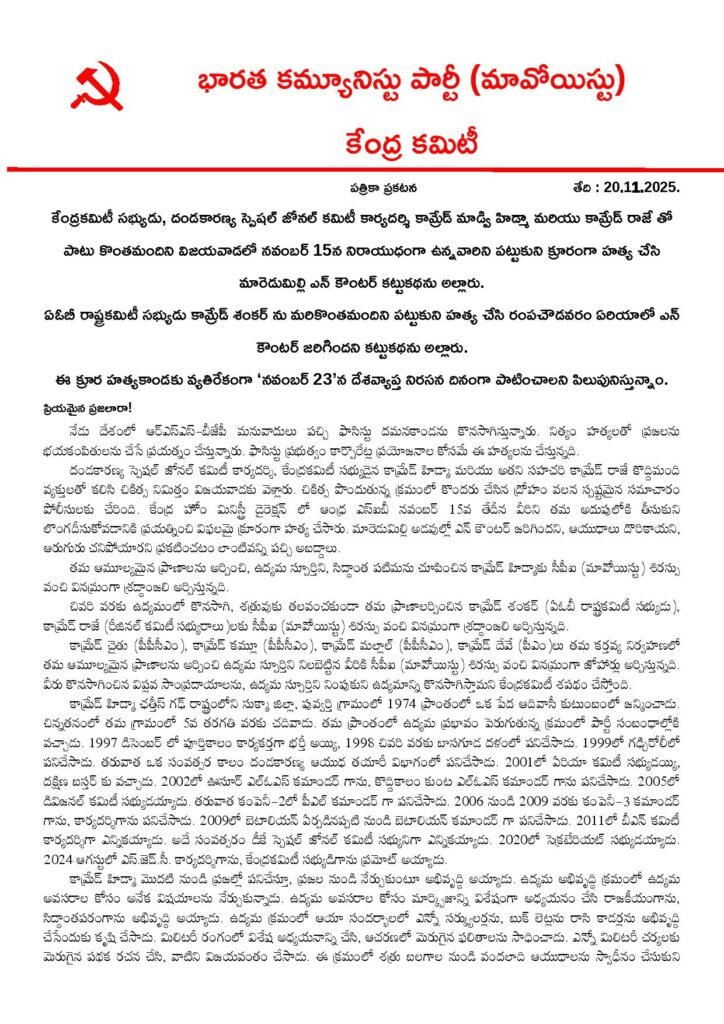 *కేంద్రకమిటీ సభ్యుడు, దండకారణ్య స్పెషల్ జోనల్ కమిటీ కార్యదర్శి కామ్రేడ్ మాడ్వి హిడ్మా మరియు కామ్రేడ్ రాజే తో పాటు కొంతమందిని విజయవాడలో నవంబర్ 15న నిరాయుధంగా ఉన్నవారిని పట్టుకుని క్రూరంగా హత్య చేసి మారెడుమిల్లి ఎన్ కౌంటర్ కట్టుకథను అల్లారు.