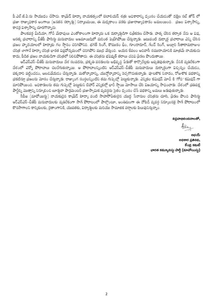 భారత కమ్యూనిస్టు పార్టీ (మావోయిస్టు) కేంద్ర కమిటీ అధికార ప్రతినిధి అభయ్ మీడియా ప్రకటన