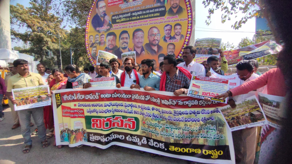 రాజ్యాంగ పరిధినిమించి కేంద్ర హోం మినిస్టర్ అమిత్ షా ను కేంద్రం నుండి భర్తరప్ చేయాలి. లొంగండి లేదా చావండి అంటూ తేదీలు నిర్ణయించడం జీవించే హక్కును హరించడమే.కేంద్ర హోం మంత్రి అమిత్ షా వాఖ్యనాలను సుమోటో గా తీసుకోని BNS 103ప్రకారం అరెస్ట్ చేసివిచారించి శిక్షించాలన్నారు.చతీష్గడ్, ఝార్కండ్, బీహార్, ఈశన్యా రాష్ట్రాల్లో, కాశ్మీర్ లలో జరుగుతున్నఅణిచివేత, సామ్రజ్యవాదుల సంపద పెంచడానికే.భారతదేశం లో ని ఖనిజసంపద ను వేదాంత్, జిందాల్, SR, మిట్టల్, డీ బీర్, అదాని, అంబాని లాంటి కార్పొరేట్ సంస్థలకు అప్పజేప్పే కుట్రలను వక్తలు ఖండించారు. ఆపరేషన్ కగార్ ను నిలిపివేసి, అడవుల్లోని సాయుధ పోలీస్ బలగాలను వెనక్కి రప్పించాలనిడిమాండ్ చేశారు. రాజ్యాంగాన్ని అపహాస్యం చేస్తు నియంత్రత్వం గా వ్యవహరిస్తున్న కేంద్ర హోం మంత్రి అమిత్ షా ను భర్తరప్ చేసేంత వరకు ప్రజాస్వామికవాదులు, పిడిత ప్రజలు ఆందోళన పోరాటాలను ఉదృతం చేయాలని కోరారు.