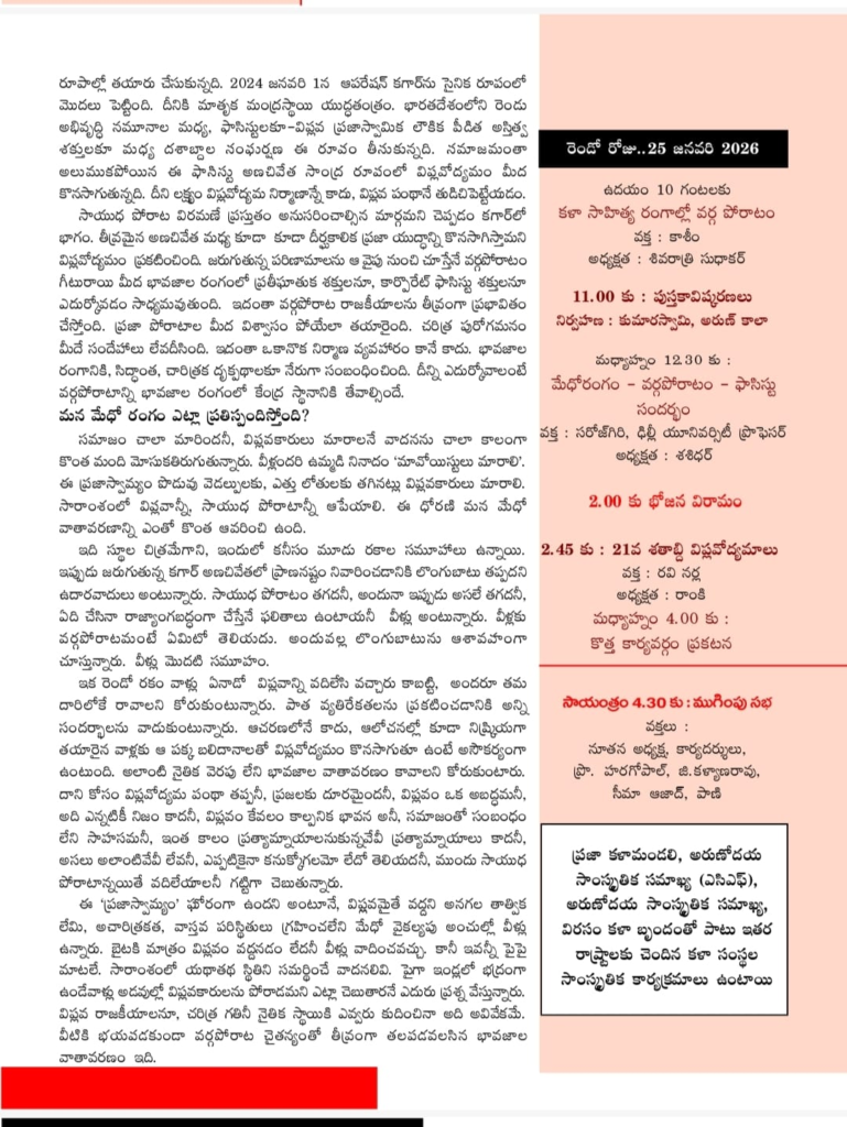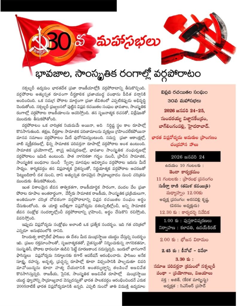 హిందుత్వ కార్పొరేట్ ఫాసిజం ఈ దేశం మీద మంద్రస్థాయి యుద్ధం చేస్తున్న సందర్భం ఇది. ప్రజల రక్తమాంసాలతో, సృజనాత్మకతతో, చైతన్యంతో నిర్మించుకున్న నాగరికతనూ, సంస్కతినీ, పోరాట ధారలనూ తుడిచి పెట్టే మారణకాండ నడుస్తున్నది. ఇందులో భాగంగానే ఫాసిస్టులు విప్లవోద్యమ నిర్మూలనకు కగార్ ఆపరేషన్ ఆరంభించారు. ఫాసిజం అనేక సూక్ష్మ, రహస్య, అదృశ్య, ప్రచ్ఛన్న రూపాల్లో కూడా విధ్వంసానికి పాల్పడుతూ చివరి మావోయిస్టును కూడా హత్య చేయడానికి అంతర్యుద్ధాన్ని తలపించే అణచివేత కొనసాగిస్తున్నది. రాజకీయ, సైనిక, సాంస్కతిక అణచివేత రూపాల్లో మంద్రస్థాయి యుద్ధ వ్యూహాన్ని సామ్రాజ్యవాద వెన్నుదన్నుతో భారత పాలకవర్గం ఆరంభించిందనే ఎరుక 2005నాటికే భారత విప్లవోద్యమానికి ఉన్నది. ఎప్పటి నుంచో జాతి విముక్తి ఉద్యమాల మీద ఈ రణతంత్రం అమలవుతూ వచ్చింది. అది కగార్ రూపంలో విప్లవోద్యమాన్ని, మొత్తంగా సమాజాన్ని అనేక స్థాయిల్లో చుట్టుముట్టిన ఈ విషాదకర సందర్భంలో విరసం తన ముప్పైవ మహా సభలను భావజాల, సాంస్కృతిక రంగాల్లో వర్గపోరాటం అనే ఇతివృత్తంతో నిర్వహించాలనుకుంటోంది.