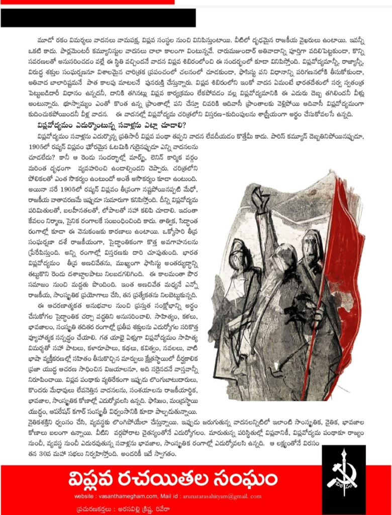 ఈ ఆచరణాత్మకత అనుభవాల నుంచి ప్రస్తుత సంక్షోభాన్ని అర్థం చేసుకోగల సైద్ధాంతిక చర్చా పద్ధతిని అనుసరించాలి. సాహిత్యం, కళలు, భావజాలం, సంస్క•తి తదితర రంగాల్లో ప్రతీప శక్తులను ఎదుర్కోగల సరికొత్త వ్యూహాత్మక సన్నద్ధం చేయాలి. గత యాభై ఏళ్లుగా విప్లవోద్యమం సాహిత్య విమర్శతో సహా పాటలు, కళారూపాలు, కథలు, కవిత్వం, నవలలు, వాటి భాషా వ్యక్తీకరణల్లో సహితం తీసుకొచ్చిన మార్పులు క్షేత్రస్థాయిలో దీర్ఘకాలిక ప్రజా యుద్ధ ఆచరణ సాధించిన విజయాలనూ, అది సరైనదనే వాస్తవాన్నీ నిరూపించాయి. విప్లవ పంథాకు వ్యతిరేకంగా ఇప్పుడు లొంగుబాటుదారులు, కొందరు మేధావులు లేవనెత్తిన వాదనలను, సంశయాలను రాజకీయార్థిక, భావజాల, సాంస్క•తిక కోణాల్లో ఎదుర్కోవలసి ఉన్నది. ఫాసిజం, మంద్రస్థాయి యుద్ధం, ఆపరేషన్ కగార్ సంస్క•తీ విధ్వంసానికి కూడా పాల్పడుతున్నాయి. నైతికశక్తిని ధ్వంసం చేసి, వ్యవస్థకు లొంగిపోయేలా చేస్తున్నాయి. ఇప్పుడు జరుగుతున్న వాదనలన్నిటిలో ఇలాంటి సాంస్క•తిక, నైతిక, భావజాల కోణాలు బలంగా ఉన్నాయి. వీటిని వర్గపోరాట చైతన్యంతోనే ఎదుర్కోగలం. మారుతున్న పరిస్థితుల్లో విప్లవానికీ, విప్లవోద్యమ పంథాకూ రాజ్యం నుంచీ, వ్యవస్థ నుంచీ ఎదురవుతున్న సవాళ్లను భావజాల, సాంస్క•తిక రంగాల్లో ఎదుర్కోవలసి ఉన్నది. ఆ లక్ష్యంతోనే విరసం తన 30వ మహా సభలు నిర్వహిస్తోంది. అందరికీ ఇదే స్వాగతం.